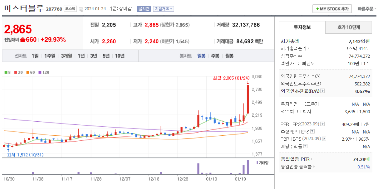 거래량도 3200만 주가 나오고 거래대금도 846억 원 발생하면서 시총이 2142억 원으로 마감을 했습니다.