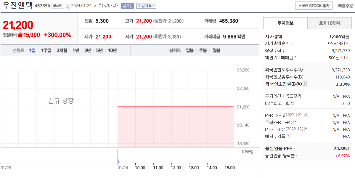 오늘 상장을 했는데 공모가 5300원 보다 높은 21200원으로 출발해서 300% 상승 마감 했습니다.