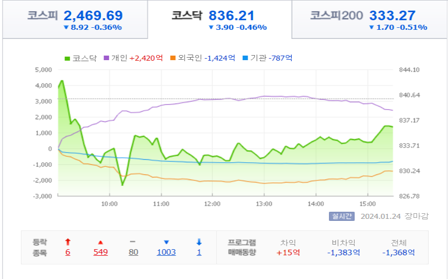 코스피지수는 전 거래일보다 8.92포인트(0.36%) 내린 2469.69로 장을 마감했습니다.