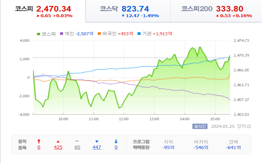 오후 들어 낙폭을 만회하고 전일 대비 상승 전환 2470.34로 0.03% 상승 마감했습니다.