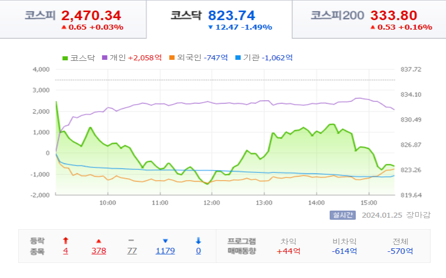 코스닥지수는 종가는 전날보다 12.47포인트(1.49%) 내린 823.74로 마감했습니다.