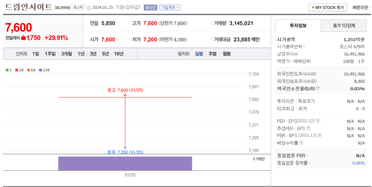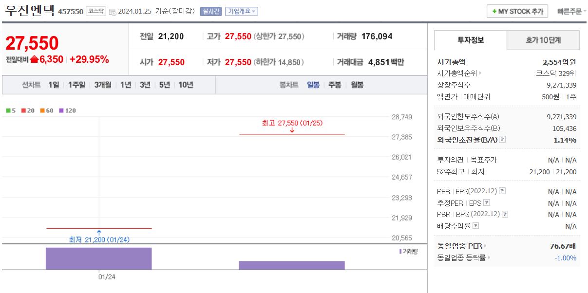 어제 상장에 300% 급등에이어서 오늘도 점상 한가 마감을 했습니다.