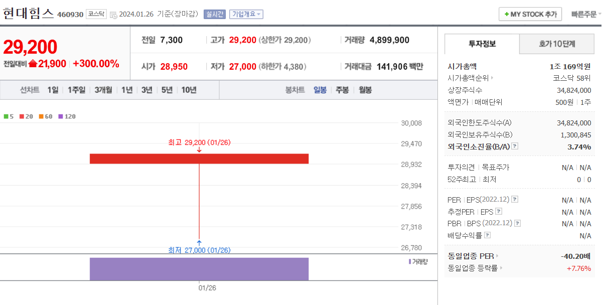 현대힘스는 오늘 신규상장한 종목으로 시작부터 강하게 상승한 후 빠르게 상한가 마감을 했습니다.