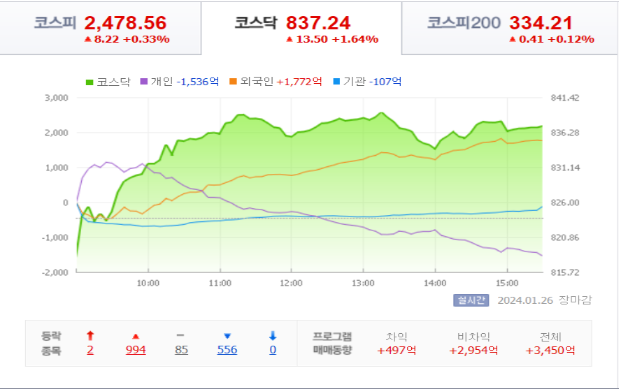 코스닥 시장에서는 외국인이 1772억원어치를 순매수했고, 개인과 기관은 각각 1536억 원, 107억 원어치를