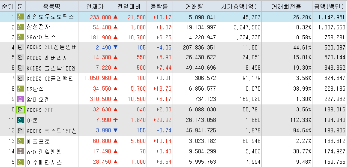 오늘 거래대금 상위종목에서 레인보우로보틱스가 큰 변동성을 보이면서 크게 상승하면서 거래대금 상위에