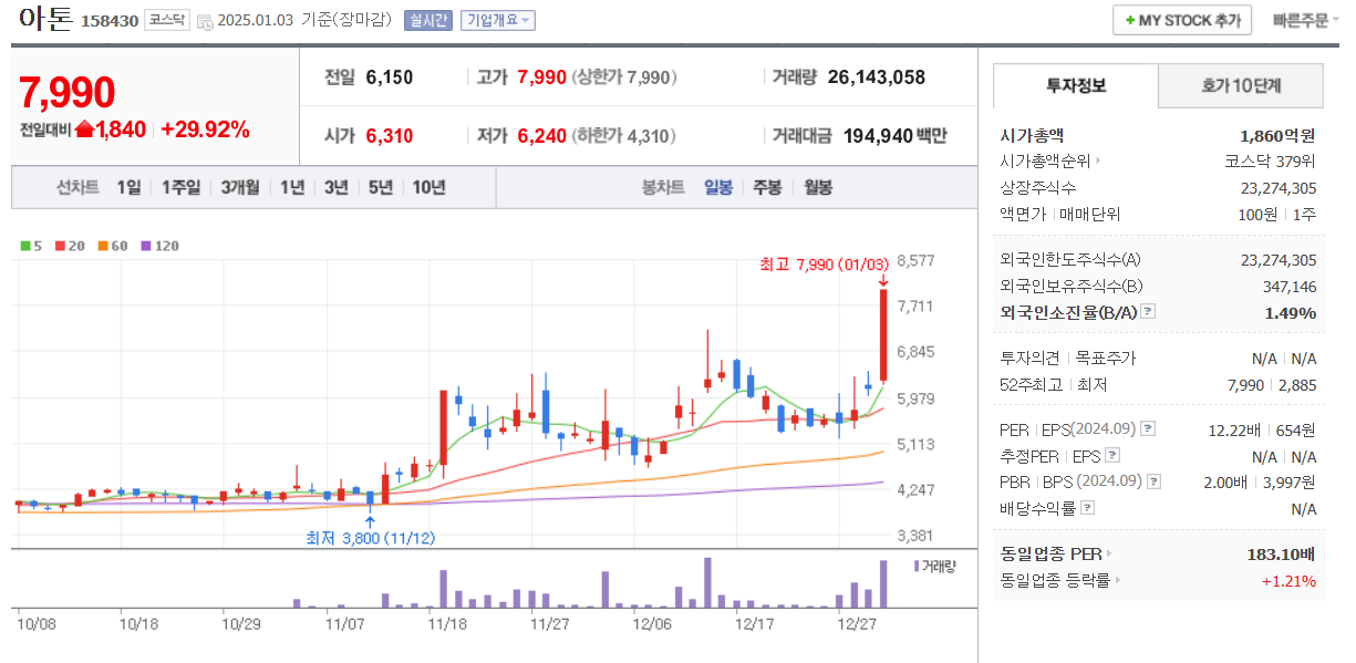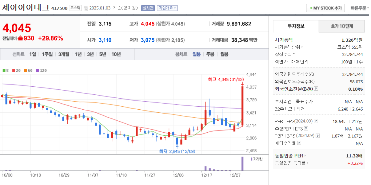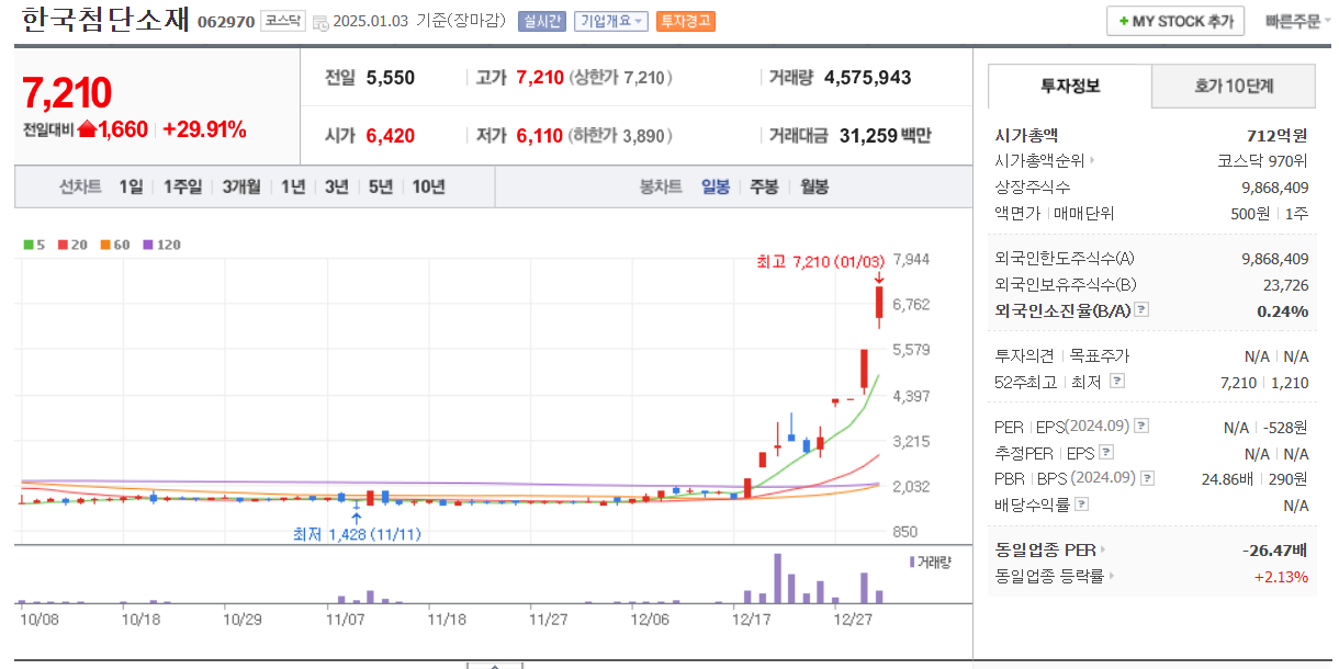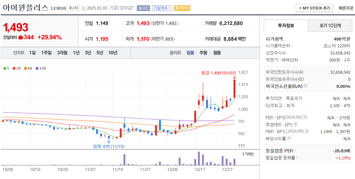 오늘 3 거래일 연속 상한가 마감을 하고 있습니다. 한 달 동안 3배 넘게 상승을 보이고 있는데