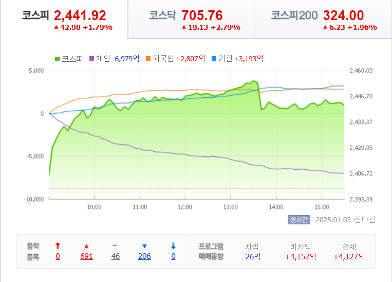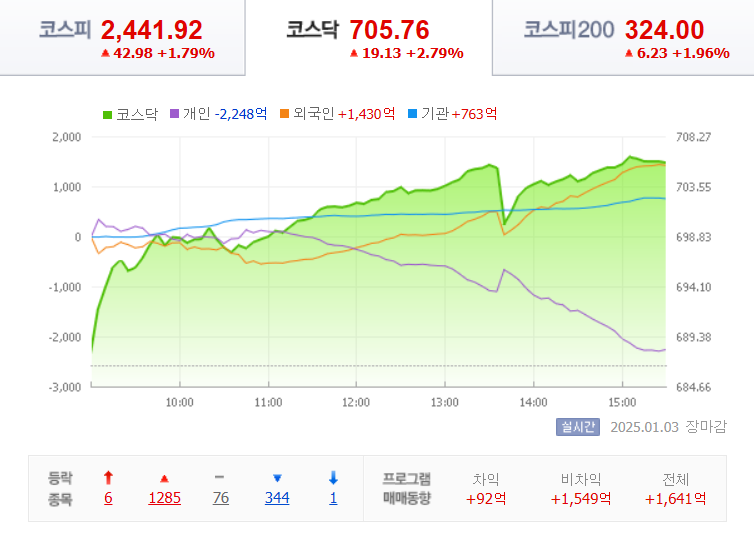 코스피 지수는 전날보다 42.98(1.79%) 상승한 2441.92로 장을 마쳤고 외국인과 기관이 각각