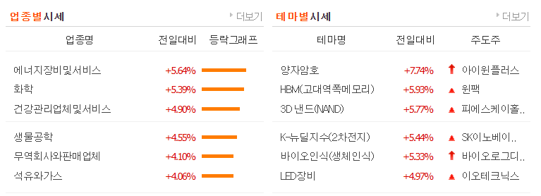 2차 전지, 양자암호 관련주가 상위에 올랐고 , 반도체, 대체에너지 관련주도 상위에 올랐습니다.