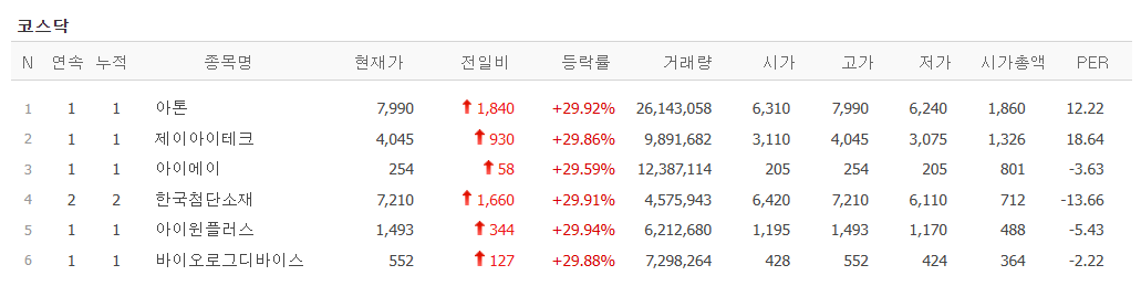 오늘의 상한가 종목