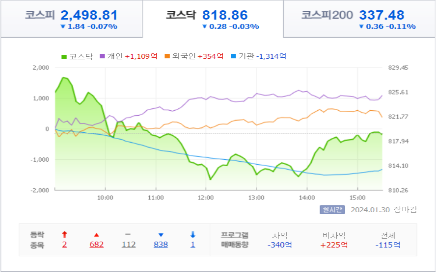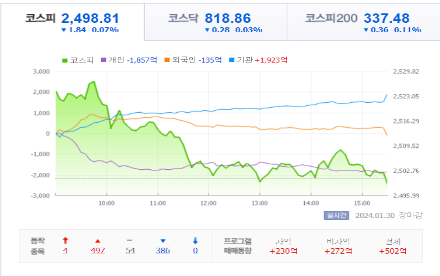 코스피 종가는 전장보다 1.84포인트(0.07%) 내린 2,498.81로 마감을 했고,