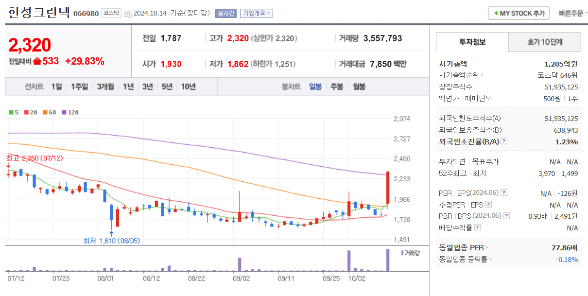 한성크린텍이 상한가를 기록했다. 14일 한성크린텍은 전 거래일보다 29.83%(533원) 오른 2320원에 장을 마감했다. 전날 한국수자원공사와 SK하이닉스가 국가 초순...