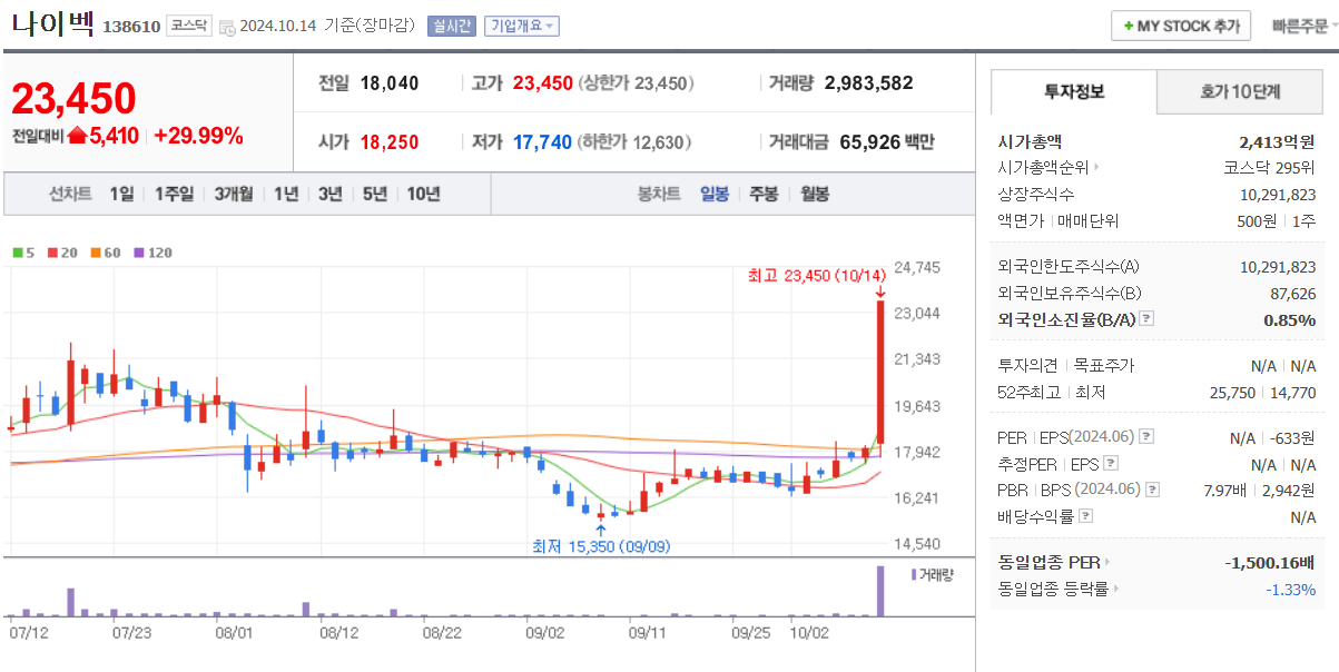 최대주주가 한세예스 24 홀딩스로 되어 있으며 이종목 역시 오늘도 갭 상한가 마감을 했습니다.
