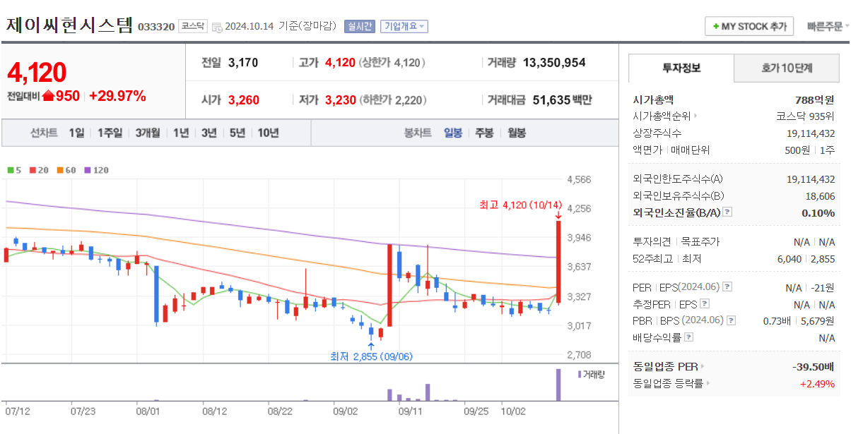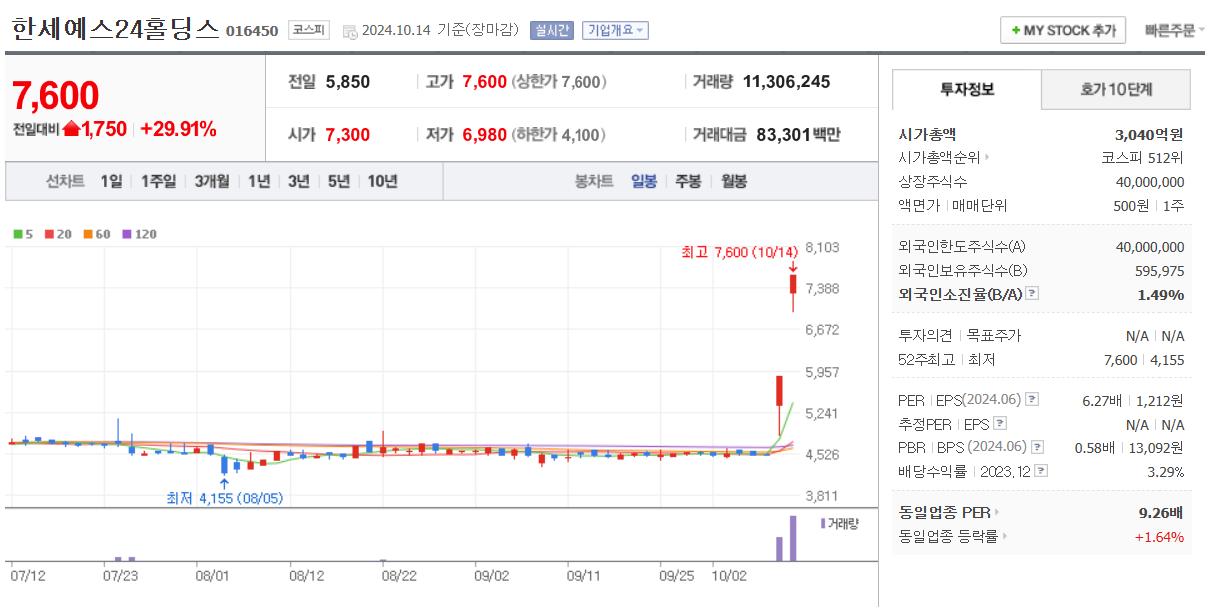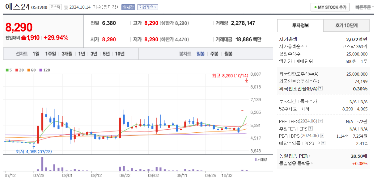 최대주주가 한세예스 24 홀딩스로 되어 있으며 이종목 역시 오늘도 갭 상한가 마감을 했습니다.