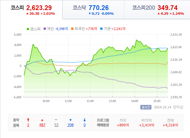 외국인과 기관이 각각 778억 원, 3241억 원 순매수를 했고 개인만 4398억 원 순매도 했습니다.