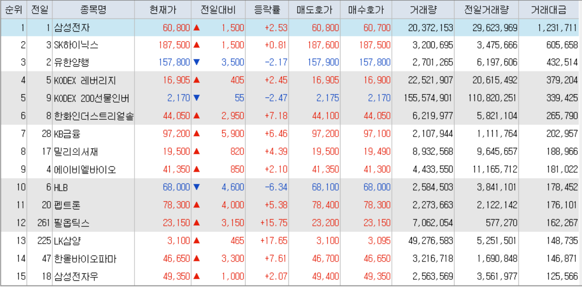 오늘 거래대금 상위종목에서는 삼성전자가 2% 넘게 상승하면서 6 만전자를 회복을 했고