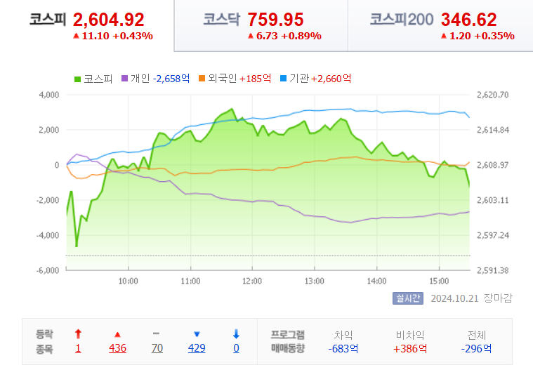 외국인과 기관이 각각 185억 원, 2674억 원 순매수를 했고 개인만 2672억 원 순매도 했습니다.