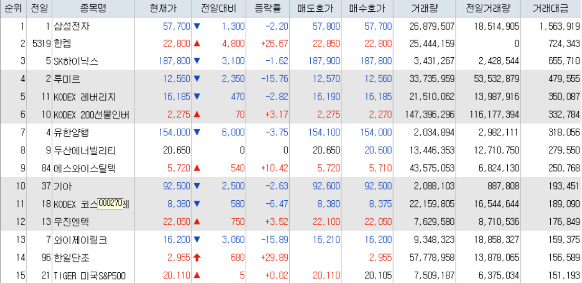 오늘 거래대금 상위종목에서는 신규상장주가 거래대금 상위를 기록했지만 전강후약을 기록했고