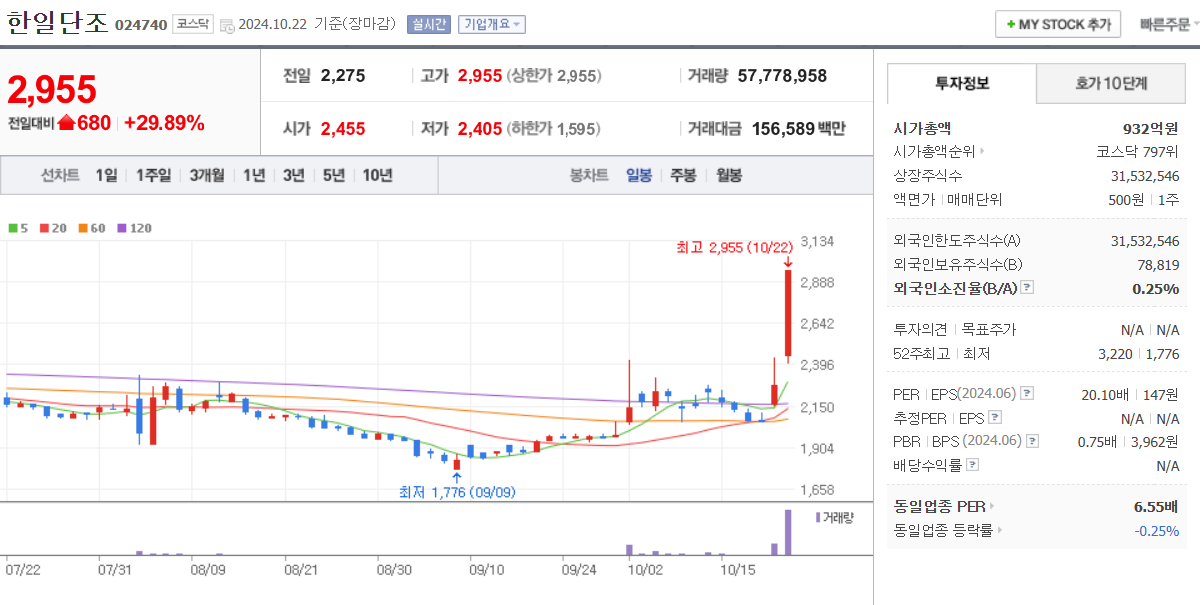 확보하고 있습니다. 오늘 상한가 이유로는 북한군이 우크라이나 파병이슈가 나오면서 방산주가