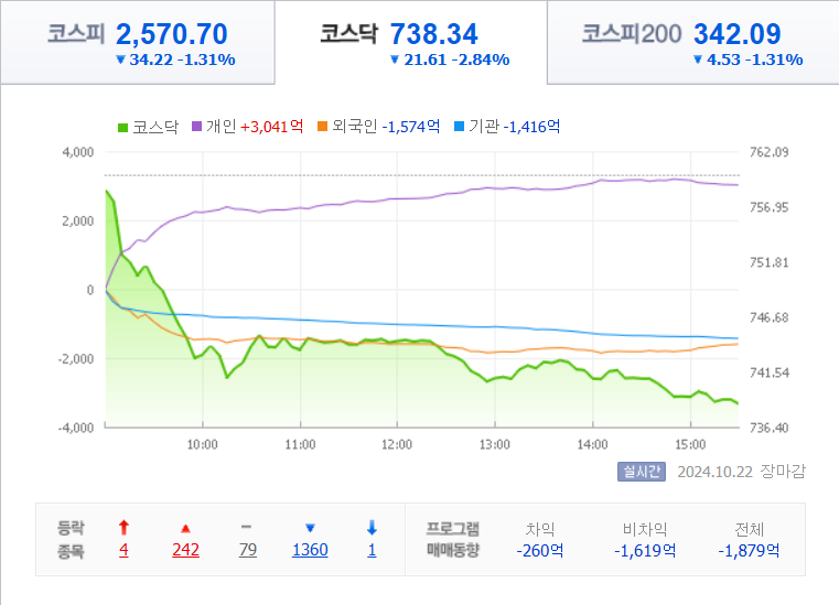외국인과 기관이 각각 1574억 원, 1415억 원 순매도를 했고 개인만 3040억 원 순매수했습니다.