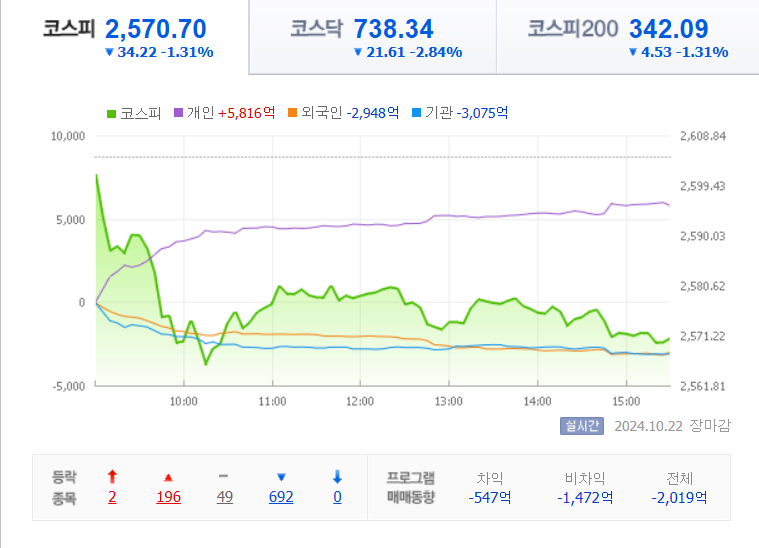 코스피 지수는 전날보다 34.22(1.31%) 하락한 2570.70으로 장을 마쳤습니다.