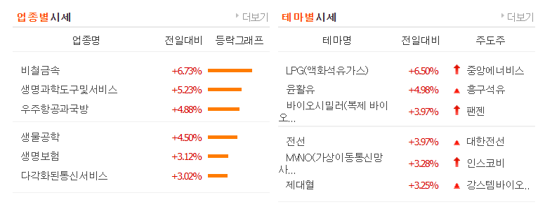 바이오, 전선, 석유, 가스 관련주가 크게 상승을 보였고 안전자산인 보험주 역시 크게 상승을 보였습니다.