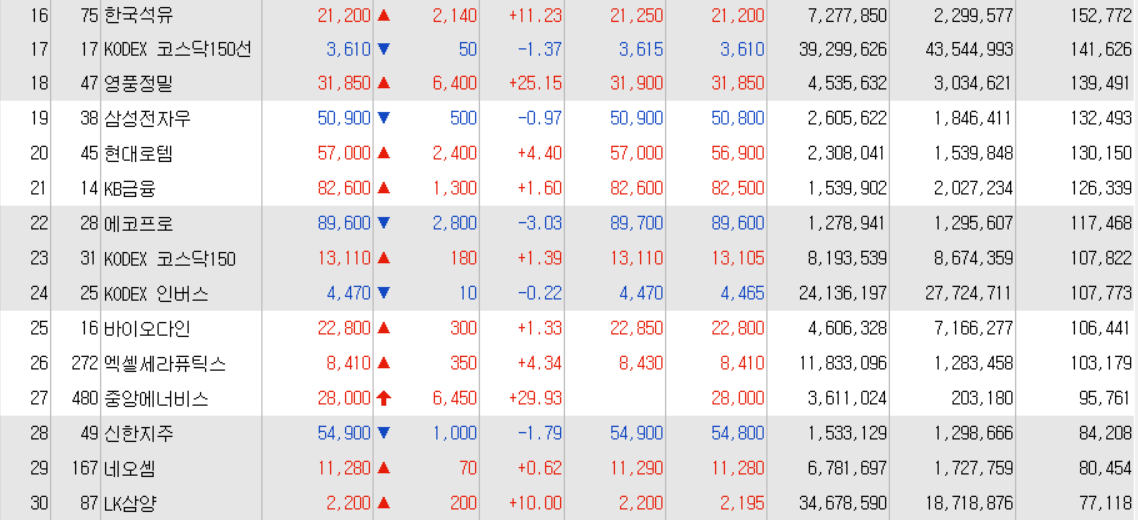- 중앙에너비스(상한가), 흥구석유(16.39%), SH에너지 화학(11.23%), 한국석유(11.23%)