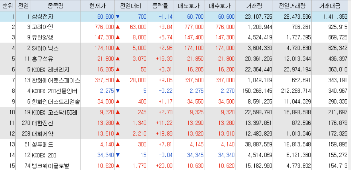 거래대금 상위종목에서 삼성전자는 계속 하락을 하고 있고 SK하이닉스의 반등이 나왔습니다.