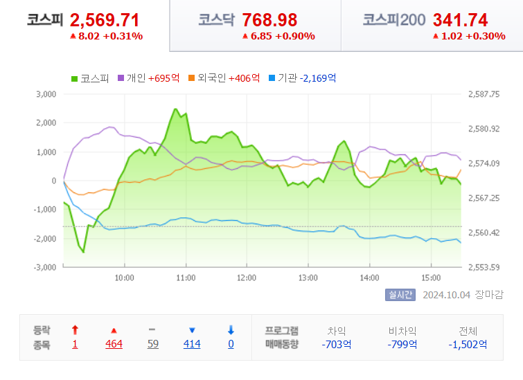 코스피 지수는 전 거래일보다 8.02(0.31%) 상승한 2569.71로 장을 마쳤습니다.