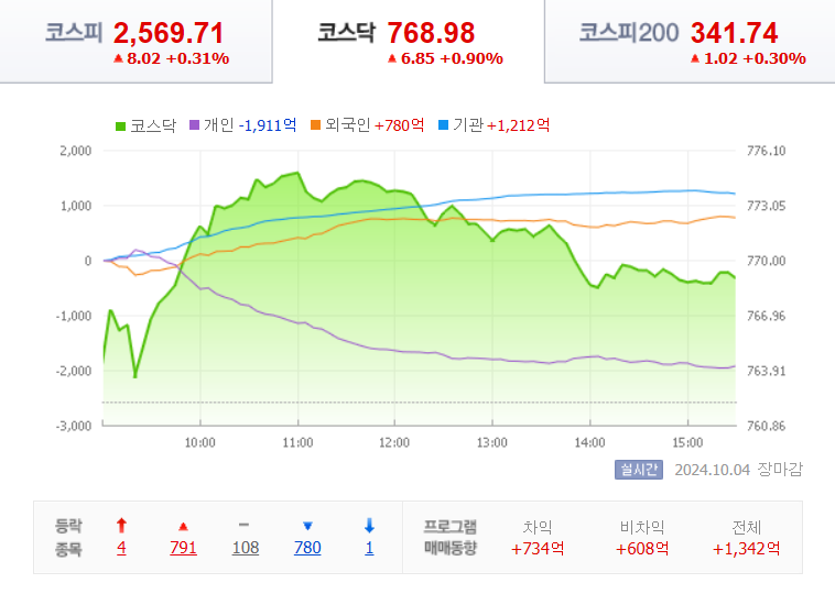 외국인과 기관이 각각 780억 원, 1212억 원 순매수를 했고 개인만 1911억 원 순매도 했습니다.