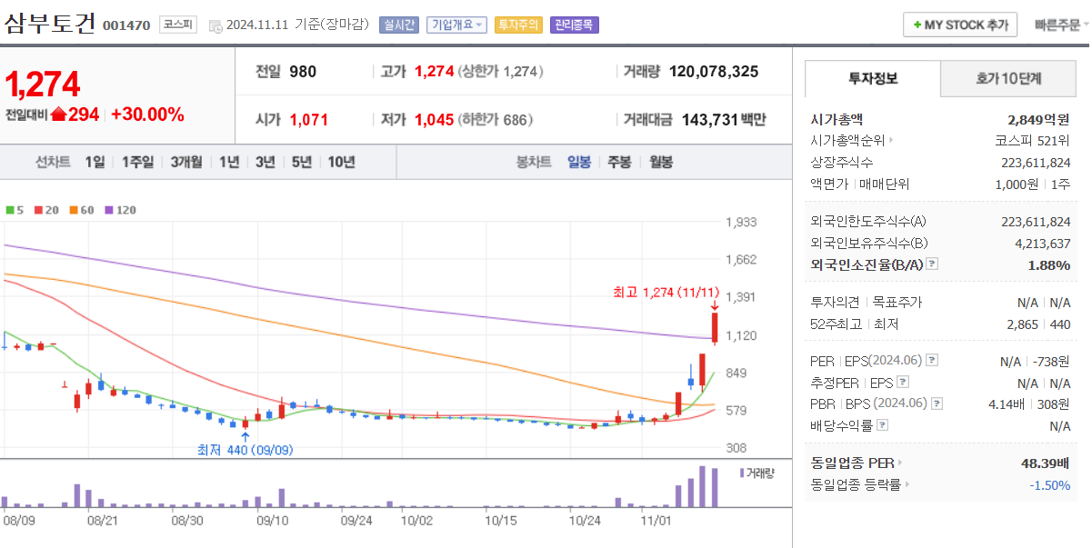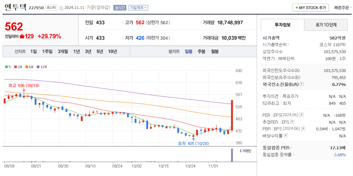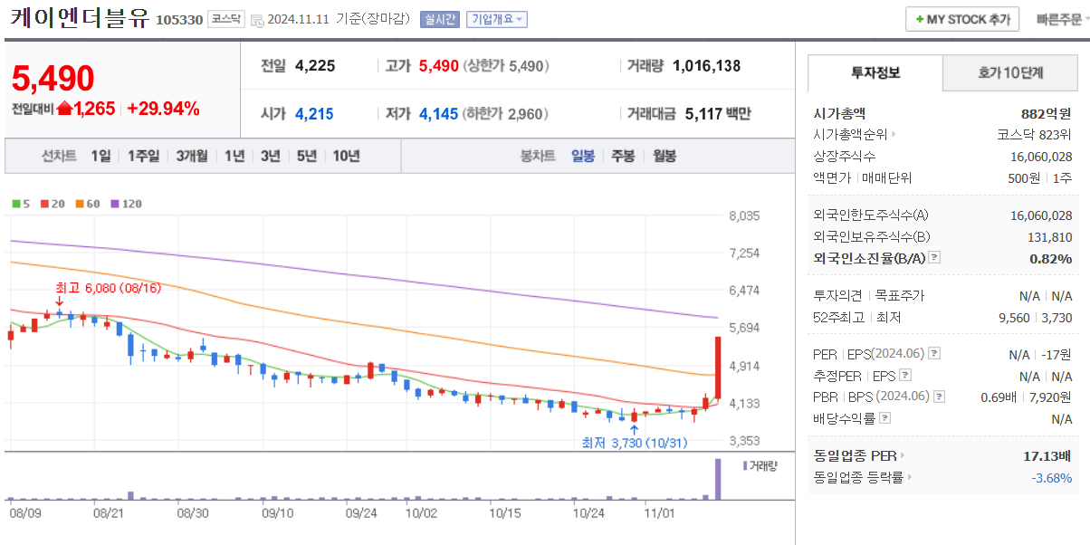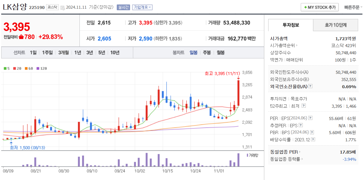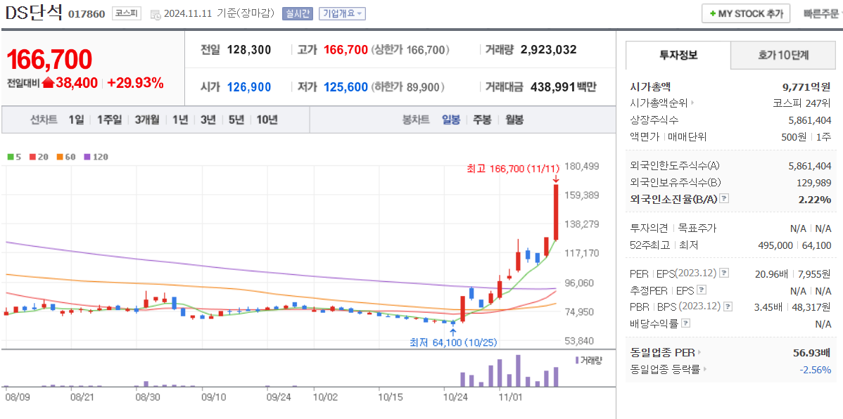 오늘은 어제에 이어서 상한가 마감을 했습니다. 지난주 미 대통령 당선 이후 상한가 마감을 했고