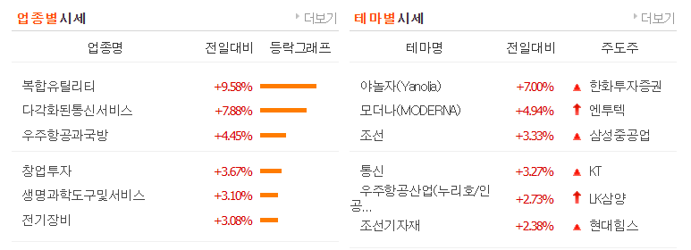 우주항공 - LK삼양(상한가), 한화시스템(13.15%), 제노코(12.37%), 한국항공우주(7.78%)