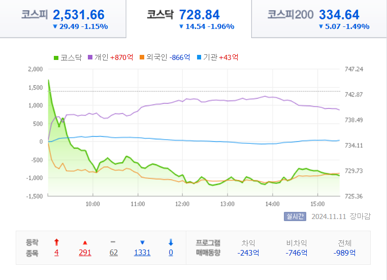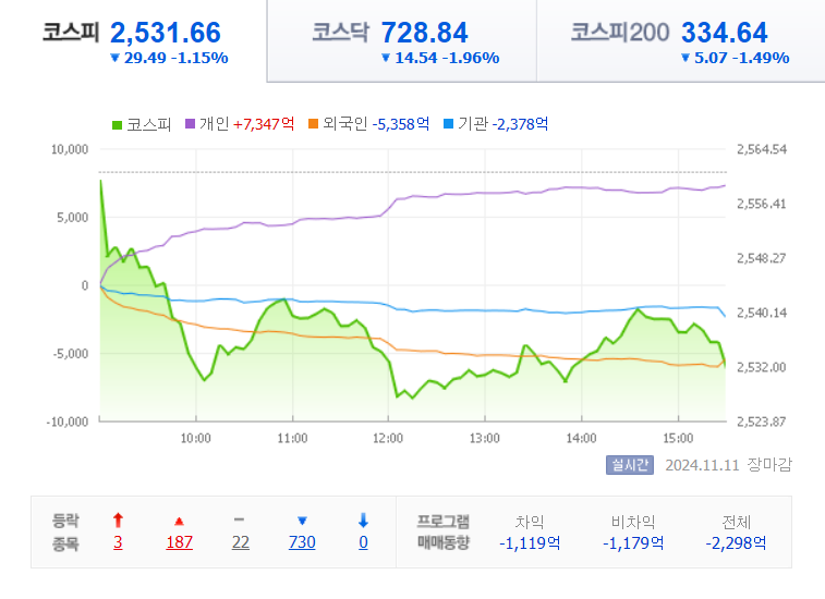 하락 마감을 했습니다. 코스피 지수는 전 거래일 보다 29.49(1.15%) 하락한 2531.66으로 장을 마쳤습니다.