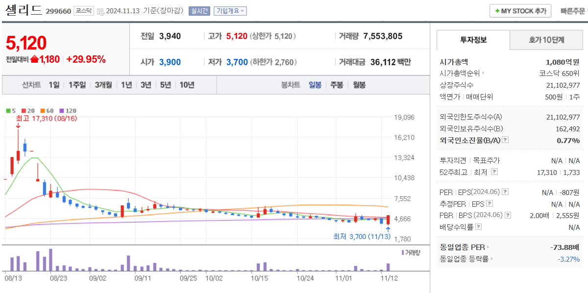 제약바이오 - 셀리드(상한가), 네이처셀(10.96%), 에이비온(3.8%), 메디콕스(3.41%)