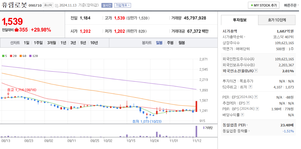 개별이슈 - 휴림로봇(상한가) - 이큐셀에 최대주주로 등극 이슈