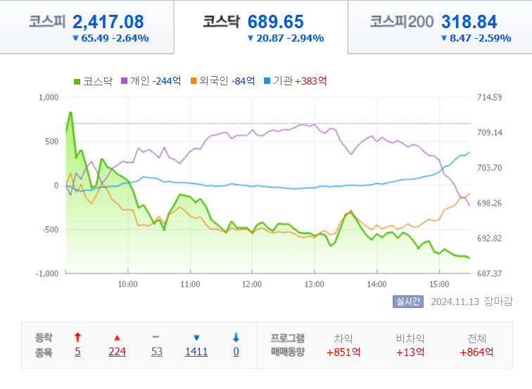 하락 마감을 했습니다. 코스피 지수는 전날보다 65.49(2.64%) 하락한 2417.08로 장을 마쳤습니다.