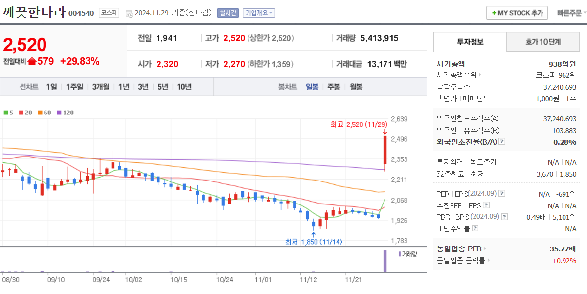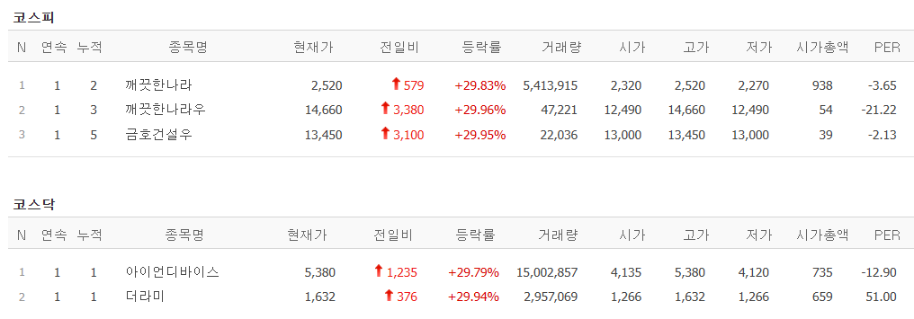 - 깨끗한 나라(상한가), 레몬(14.59%), 모나리자(13.65%), 비비안(5.86%)