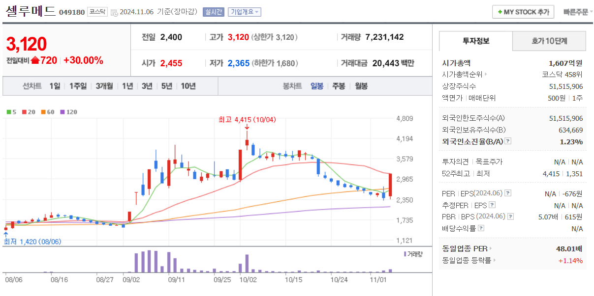 이슈가 나오면서 상한가 마감 한 것으로 보입니다. 차트상으로 60일 선을 깼었는데 오늘 반등과