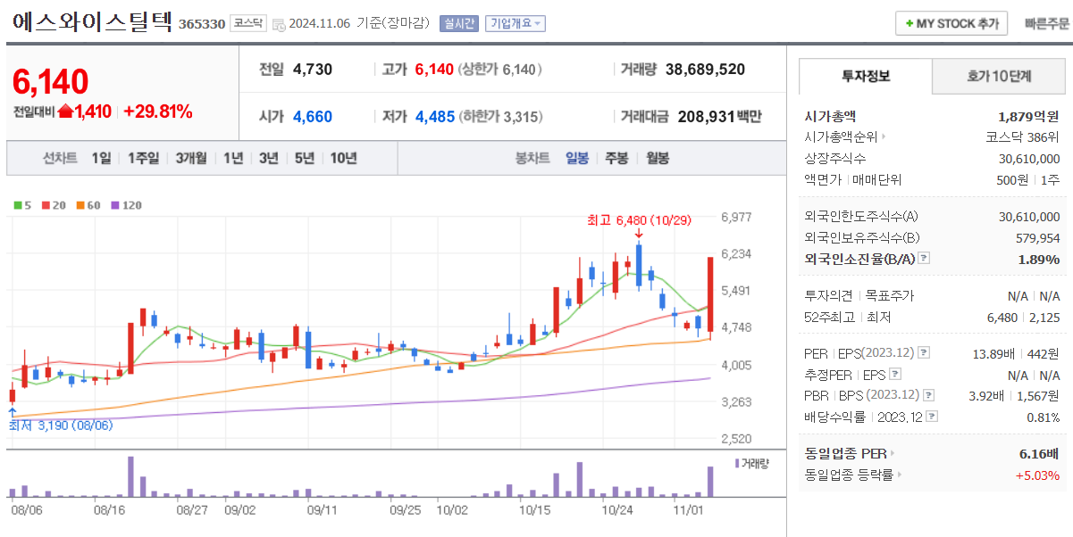 차트상으로는 신고가 이후 하락을 하다가 오늘 20일선에서 반등을 하면서 상한가 마감을 했는데