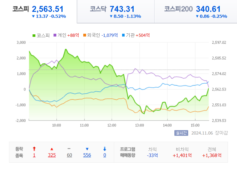 오늘 코스피 지수는 상승출발 했지만 트럼프 당선 가능성이 높아지면서 외국인 매도세로 하락 마감했습니다.