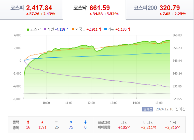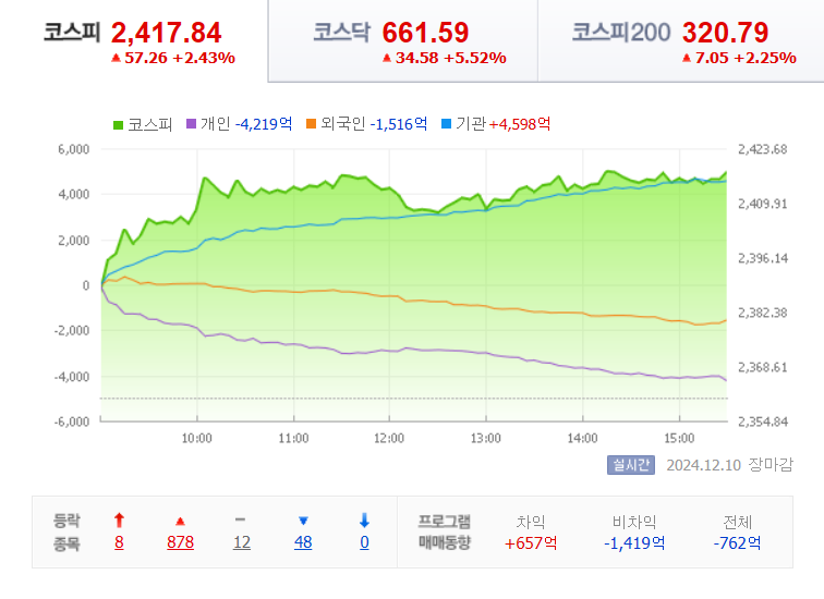 코스피 지수는 전날보다 57.26(2.43%) 상승한 2417.84로 장을 마쳤습니다.