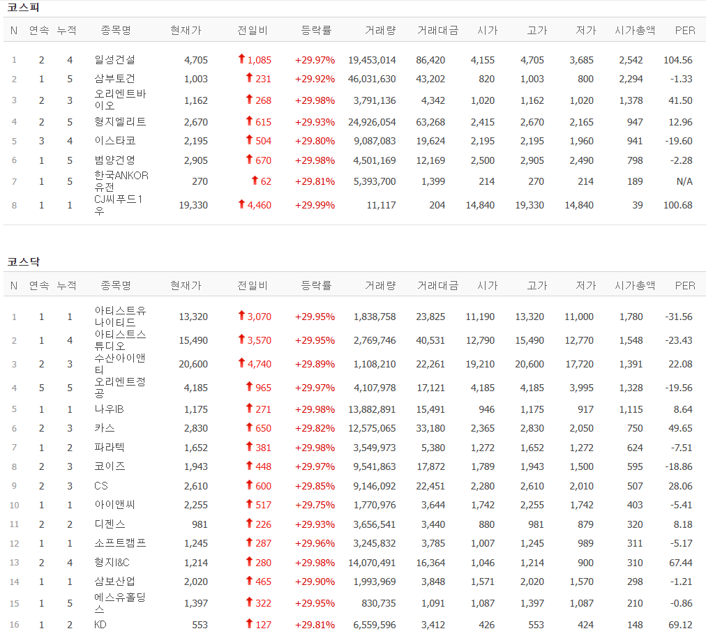 오늘의 상한가 종목