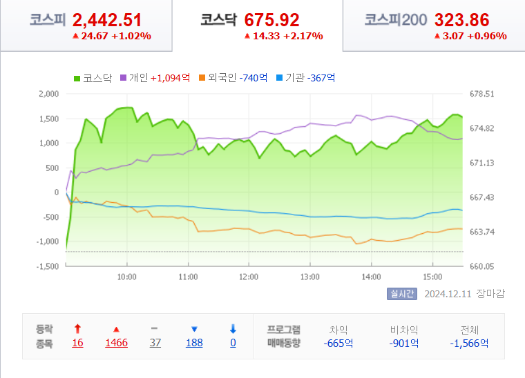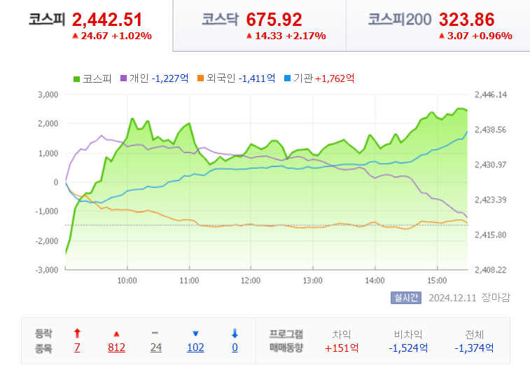 코스피 지수는 전날보다 24.67(1.02%) 상승한 24.67로 장을 마쳤습니다.