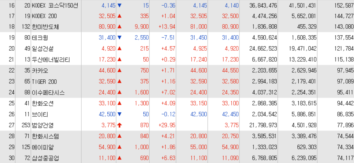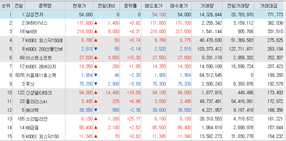 오늘 거래대금 상위종목에서는 네이버 종목이 탄핵정국 트래픽 증가 및 AI 관련주 주목으로 크게