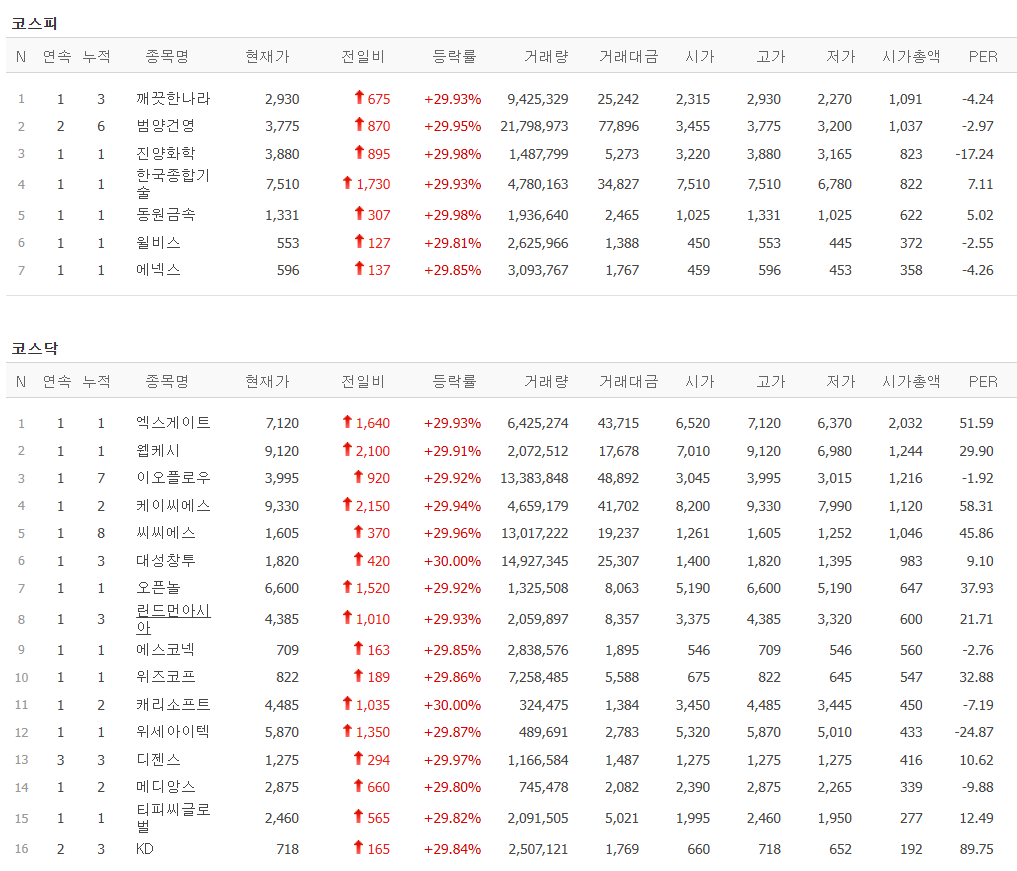 오늘도 상한가 종목이 다수가 나왔습니다. 무려 코스피에서 7 종목, 코스닥에서 16 종목 이 나왔습니다.