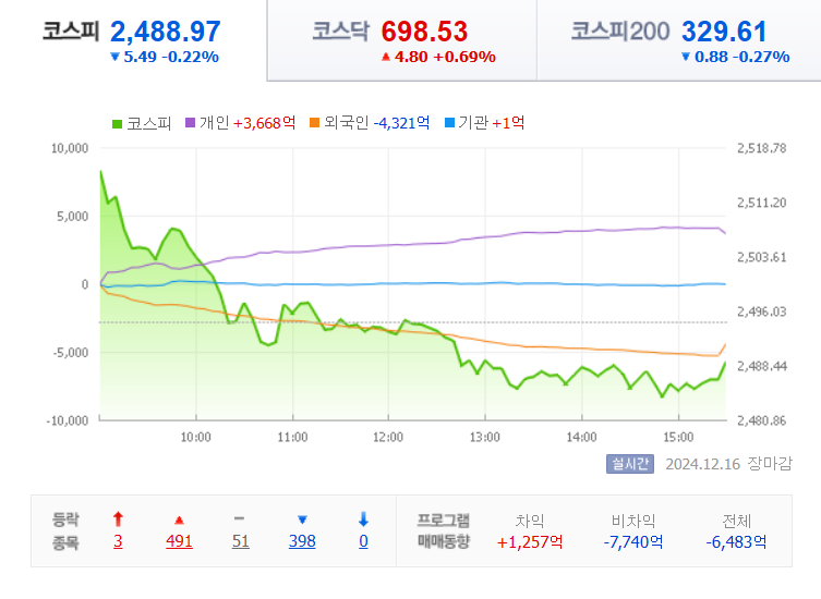 매도로 하락 마감했습니다. 코스피 지수는 전 거래일보다 5.49(0.22%) 하락한 2488.97로 장을 마쳤습니다.