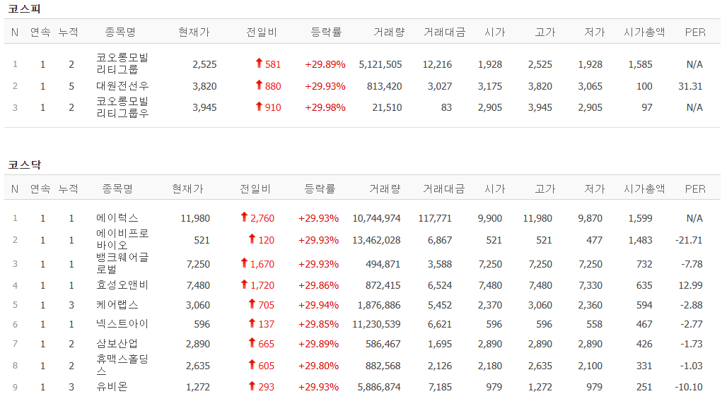 상한가 마감을 했습니다. 동전주이고 평소 거래량이 적은 종목인데 이런 종목들이 갭상승 상한가