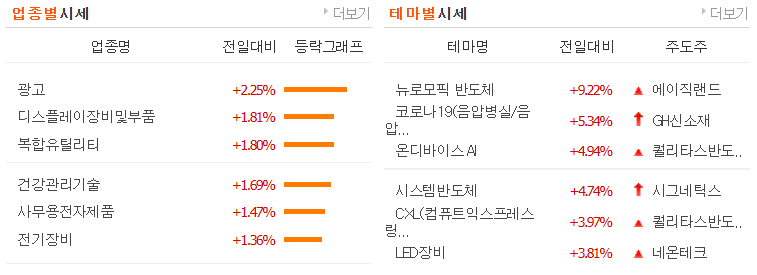 코스닥 시가 총액 상위 종목에서는 시스템 반도체 관련주가 크게 상승을 보였고 초전도체, 의료 AI