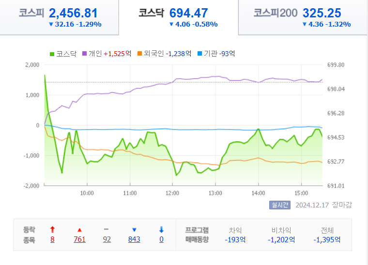 하락 마감했습니다. 코스피 지수는 전날보다 32.16(1.29%) 하락한 2456.81로 장을 마쳤습니다.