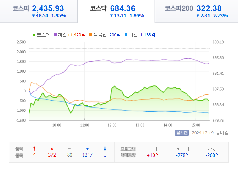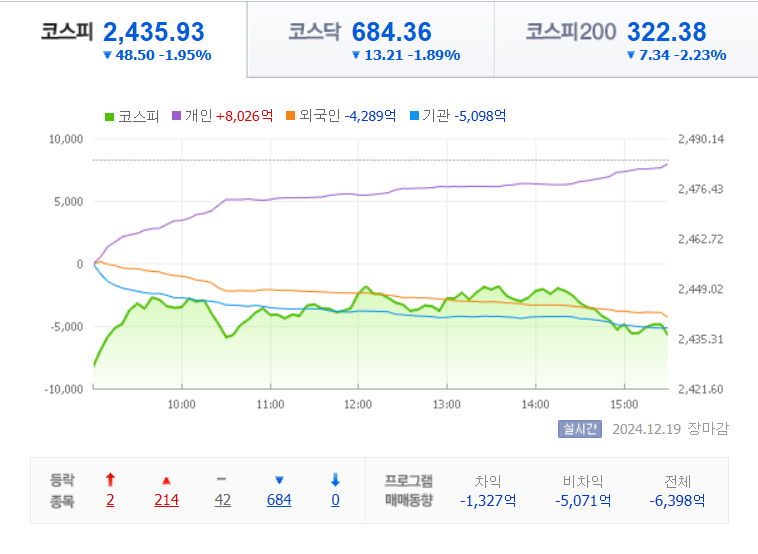 코스피 지수는 전날보다 48.50(1.95%) 하락한 2435.93으로 장을 마쳤습니다.