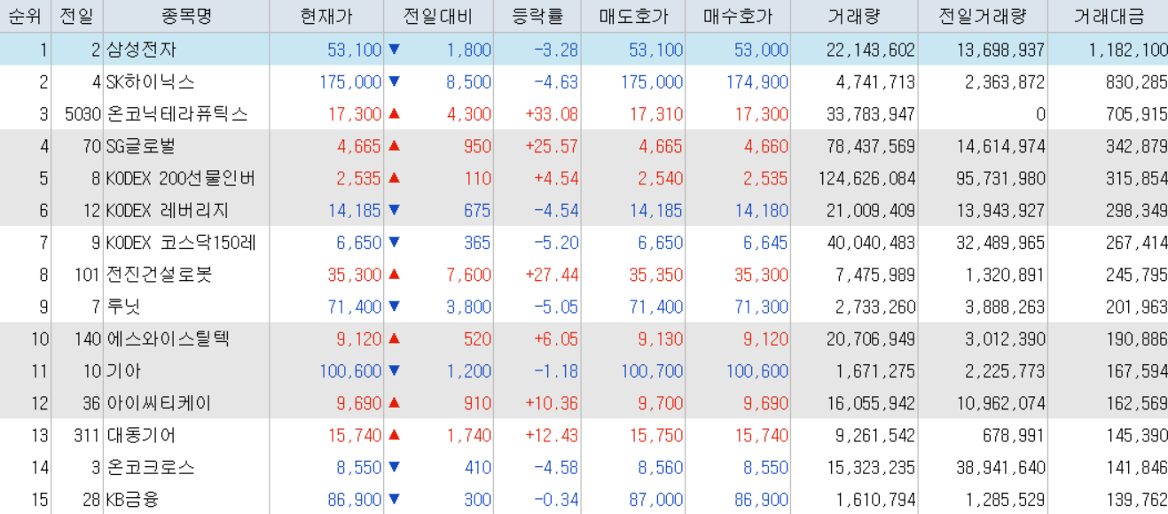 오늘 거래대금 상위 종목에서는 오늘도 신규상장주인 온코닉테라퓨틱스 종목이 전강후약을 보이면서